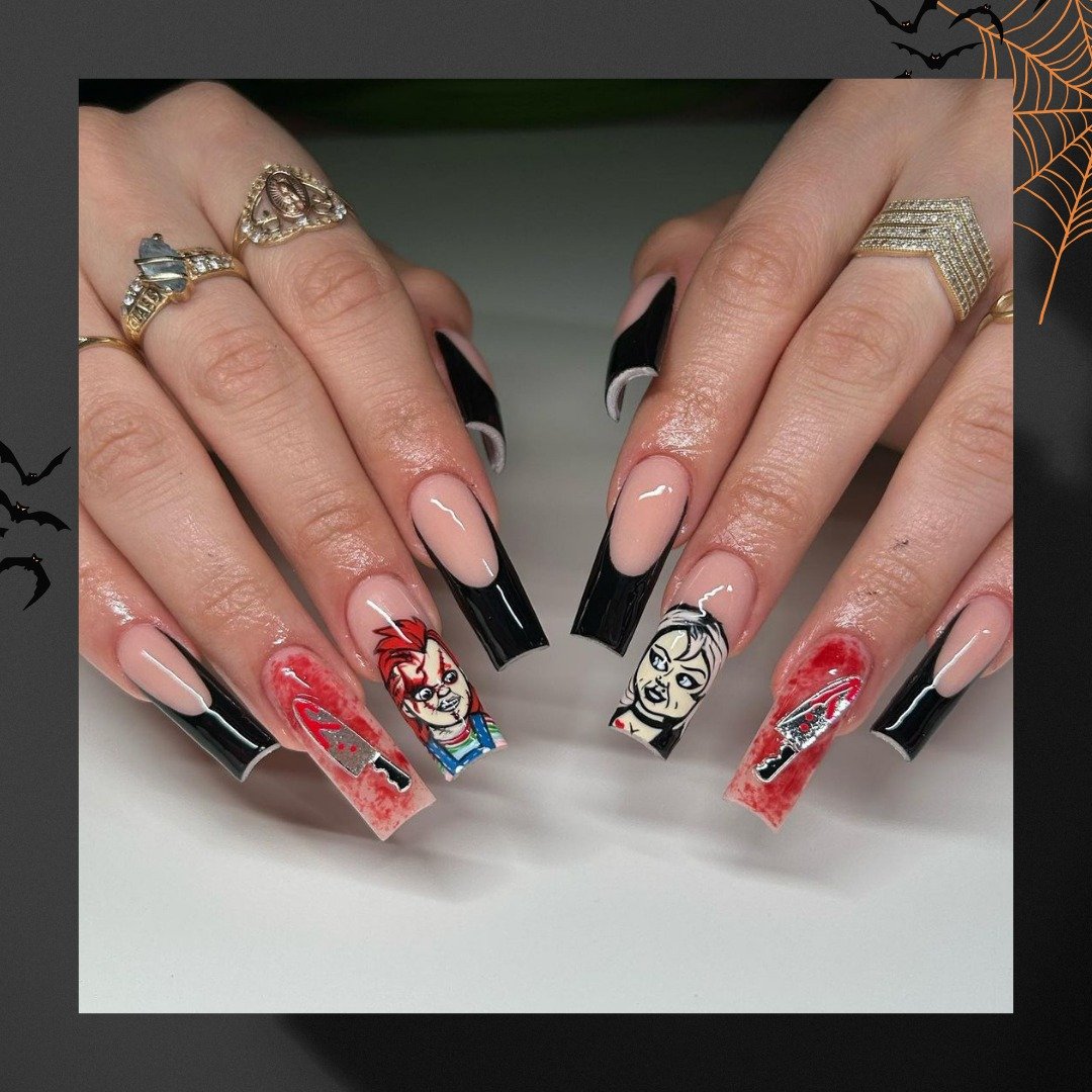 Glossy black French tips frame the real star here: the bloodied knives and dead-eyed dolls. @sanailsspa1 nails the Chucky & Tiffany vibe without going overboard—just clean lines, creamy nudes, and bursts of gore where it counts.