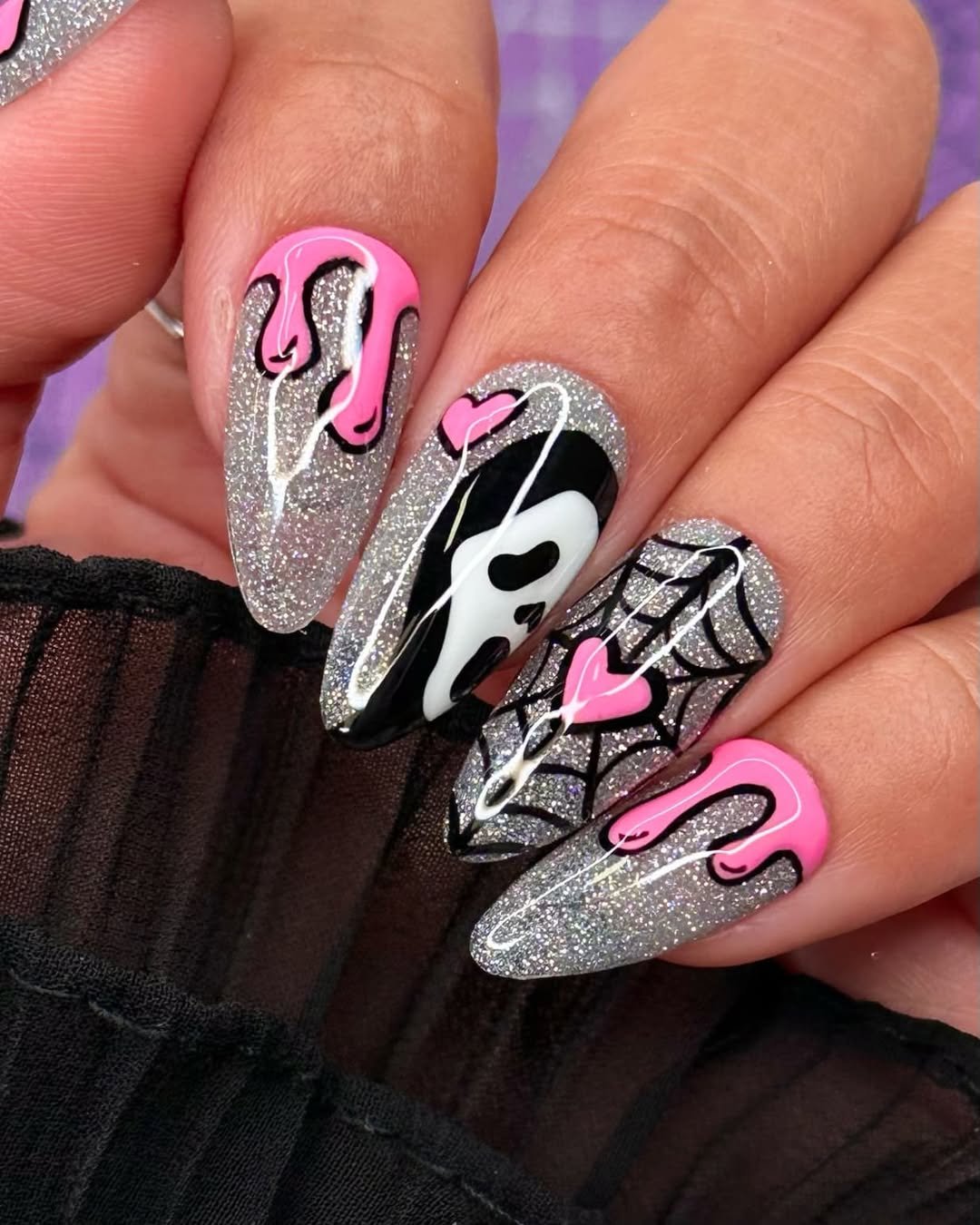Pink, but make it haunted. @nylove_nail blends bubblegum sweetness with webbed darkness, like a vampire love letter sealed with glitter. Between the spiderweb hearts and Scream’s cameo moment, this mani has serious range—from flirt to fright in one swipe.