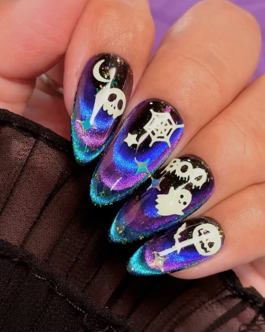 Dark meets dreamy in this galactic design from @daily_charme. A rich, shimmering aurora backdrop sets the stage for glow-in-the-dark ghosts, crescent moons, and cobweb stars. These nails are practically a tiny Halloween rave—with just enough mystery.