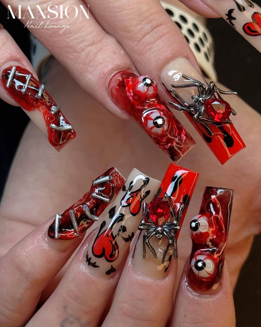 @manson_nail_lounge takes high drama to another level. Red chrome flames, silver stitches, and oversized gems make this nail set feel like gothic art. The sculpted 3D spiders and bloodshot eyeballs? Absolute showstoppers.
