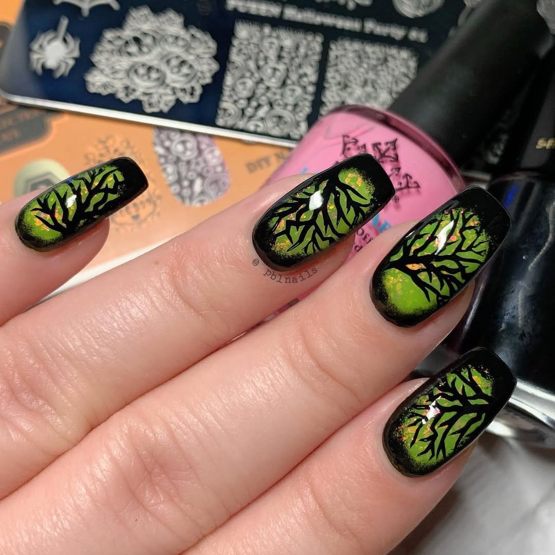 @pblnails took eerie forest vibes and turned them into a glowy masterpiece. These green-to-black ombré nails are overlaid with stark tree silhouettes, like the last glimpse of woods before something rustles… and runs. The subtle shimmer beneath makes them feel enchanted but still a little ominous.