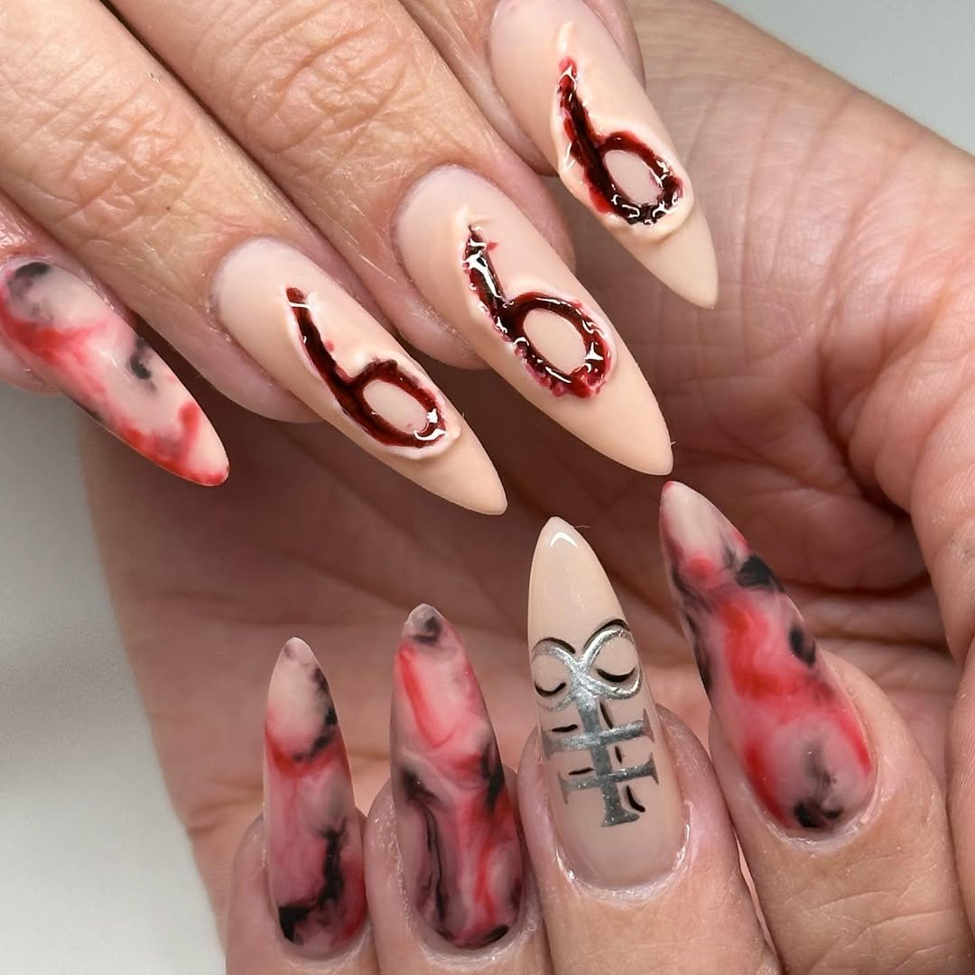 And then there’s that smoky blood marble. Those swirls of red, black, and soft beige feel almost painterly — like ink bleeding through silk. It’s moody. It’s powerful. And the silver sigil? Just the right touch of mystery to keep you wondering what story these nails are trying to tell.