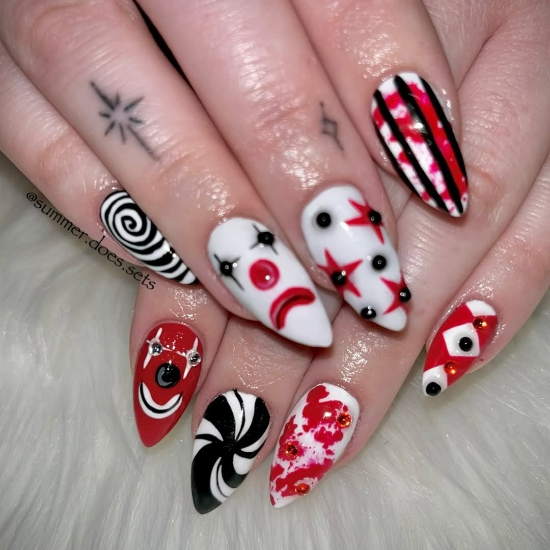 @summer.does.sets dials up the circus horror with spinning spirals, clown tears, and the kind of color blocking that makes your eyes dance. The red, white, and black palette keeps it cohesive, even when the elements clash like a twisted funhouse.