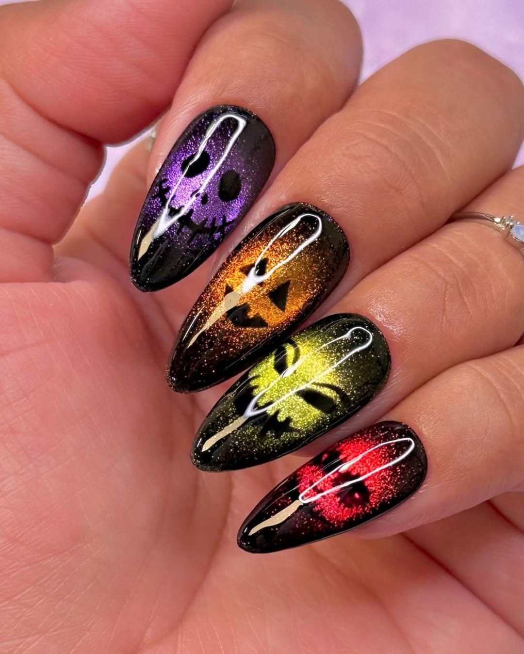 This spooky-sparkle gradient is the glow-up your jack-o’-lantern never saw coming. @daily_charme uses vivid metallic purples, oranges, and yellows to create ghoulish faces that shimmer beneath a glossy black base. The result? Halloween night meets stardust.