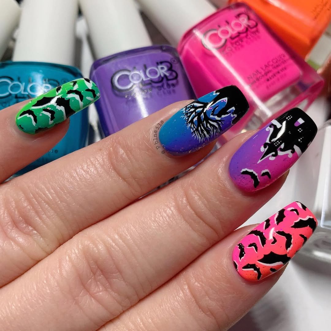 This one is pure candy-fueled chaos. @pblnails combines hot pink bats, haunted house cut-outs, and a technicolor tree swirl that feels straight out of an animated Halloween special. The sky gradients? Total scene-stealer.