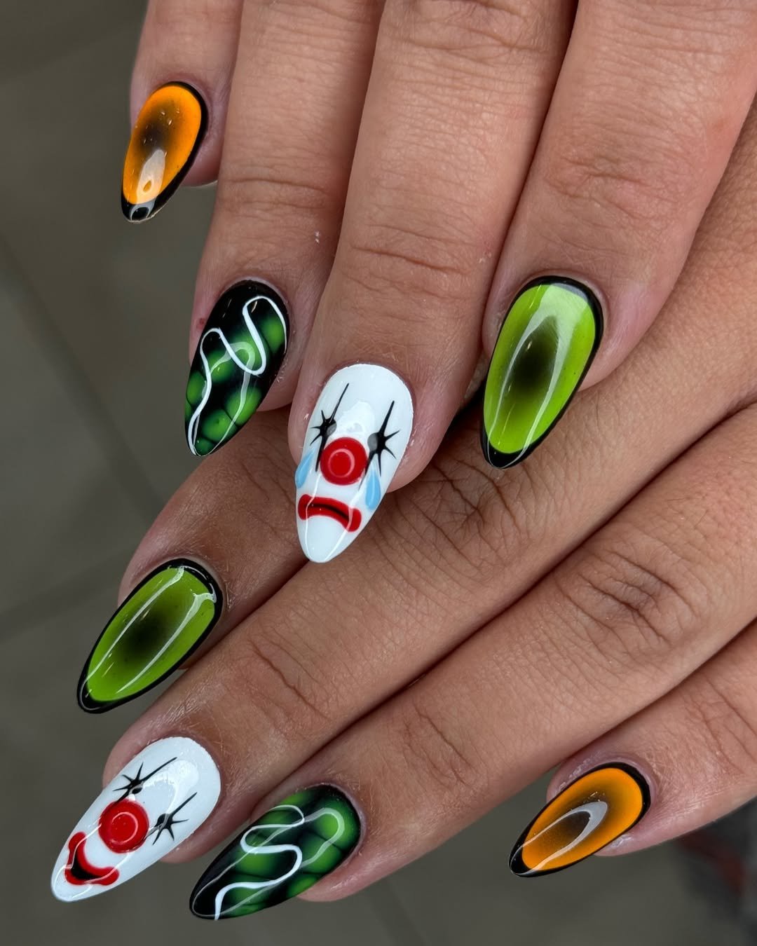 This set is wild, weird, and wonderfully clownish—in the best Halloween way. @nailsbytrinnie goes full send with acid green cat-eyes, high-shine orange, and those teary-eyed clown faces that are more sad-core pop art than silly. It’s a chaotic palette, but somehow the balance just clicks.