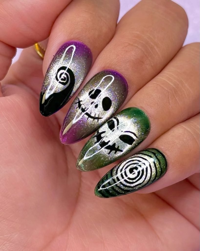 @daily_charme takes a left turn into iridescent glam with this Nightmare Before Christmas-inspired moment. Smoky greens and purples melt into shimmering silver, with swirling spirals and stitched-on smirks adding that eerie, whimsical flair.