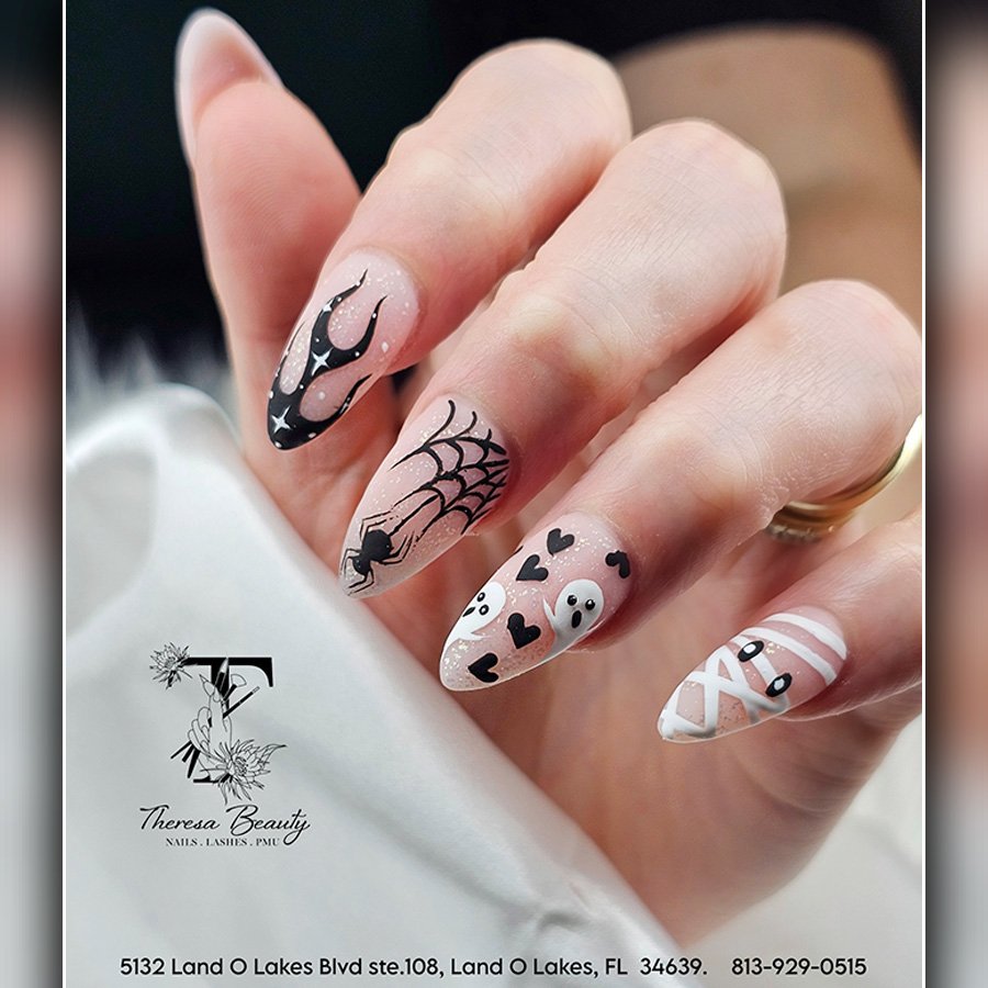 This set feels like a spooky rom-com in nail form—haunting, yes, but make it flirty.