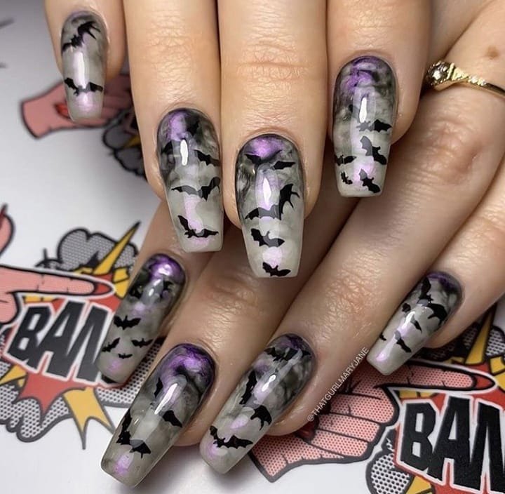 Smoky swirls of black and gray with flashes of violet—@halloweennailsofficial goes a little moodier with this marbled bat set. It’s giving foggy graveyard at twilight. The bats feel like shadows caught mid-flight, and the glassy shine makes them pop even more.