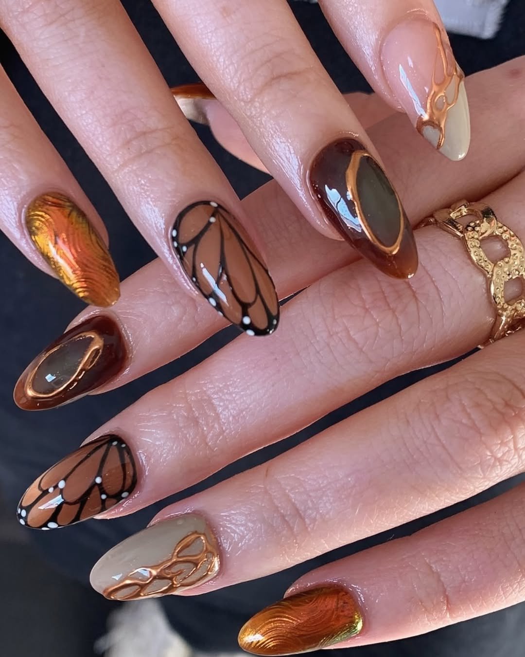 @kelly_nailsandspa goes full artistic mode with this butterfly-inspired masterpiece. Rich coppers, warm caramels, and golden metallics swirl together to create something that’s equal parts fierce and delicate. The mix of textures — from shimmery chrome to matte-like finishes — makes each nail feel unique.