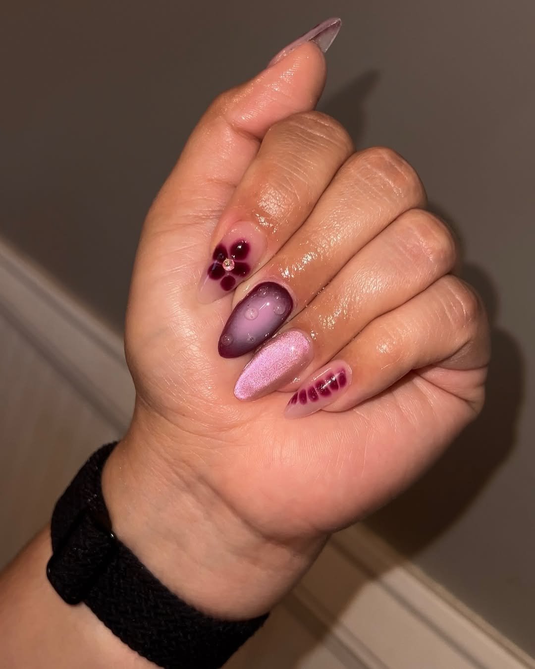@nailedbyaimee goes full creative with this rich plum and pink combo. The mix of matte and glossy textures gives it depth, while the 3D floral detail makes it pop in the most unexpected way. It’s moody but romantic — a love letter to fall colors.