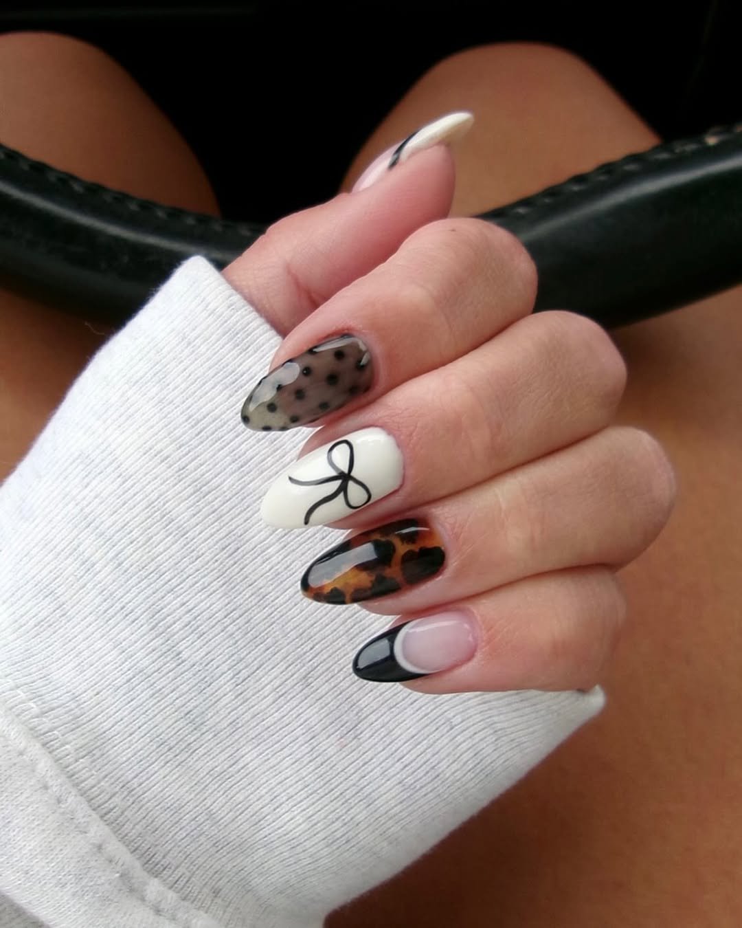 This playful set by @han.polished brings a little personality to every nail. Between the dainty bow, leopard print, and sheer polka dots, it’s giving “coquette meets fall chic.” Each design stands out but somehow still feels cohesive — a true nail art flex.