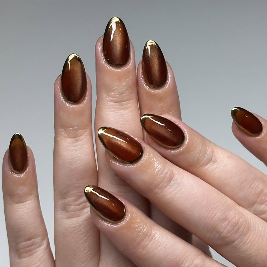 @nailsbyskyelinh brings metallic magic to the season with these bronze cat-eye nails. The way the light catches that golden edge is hypnotic — warm, dimensional, and dripping with sophistication.