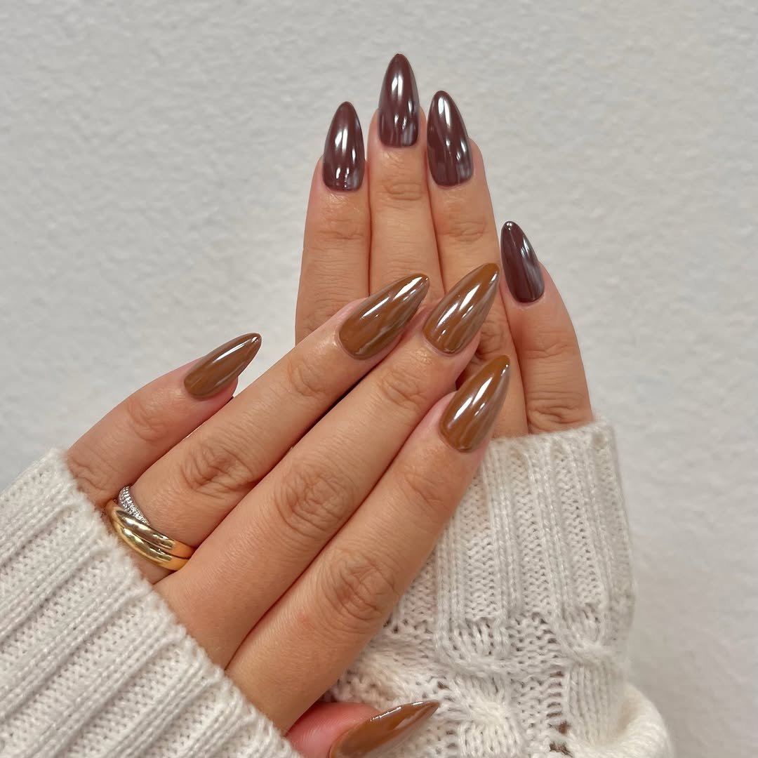 @daily_charme serves up pure molten magic with this brown and bronze chrome duo. It’s high-shine, high-impact, and feels like the ultimate fall fashion accessory. The light hits these nails and you just know they turn heads.