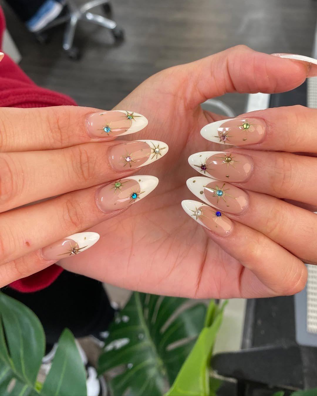 @nylove_nail turns a classic French tip into something cosmic. These creamy white tips are paired with delicate gold stars and colorful rhinestones that shimmer like a constellation across your fingertips. It’s minimal but radiant — like jewelry built right into your nails.