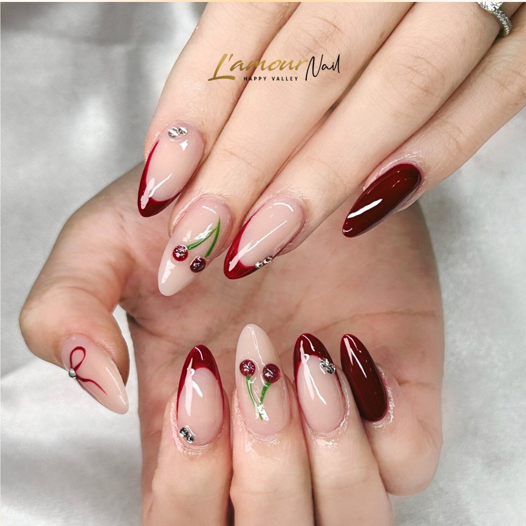 This set from @lamournailspasalon is pure retro romance. Deep red French tips meet soft nude bases, and the tiny cherry accents add the sweetest pop of color. It’s flirty, vintage-inspired, and just the right amount of playful.