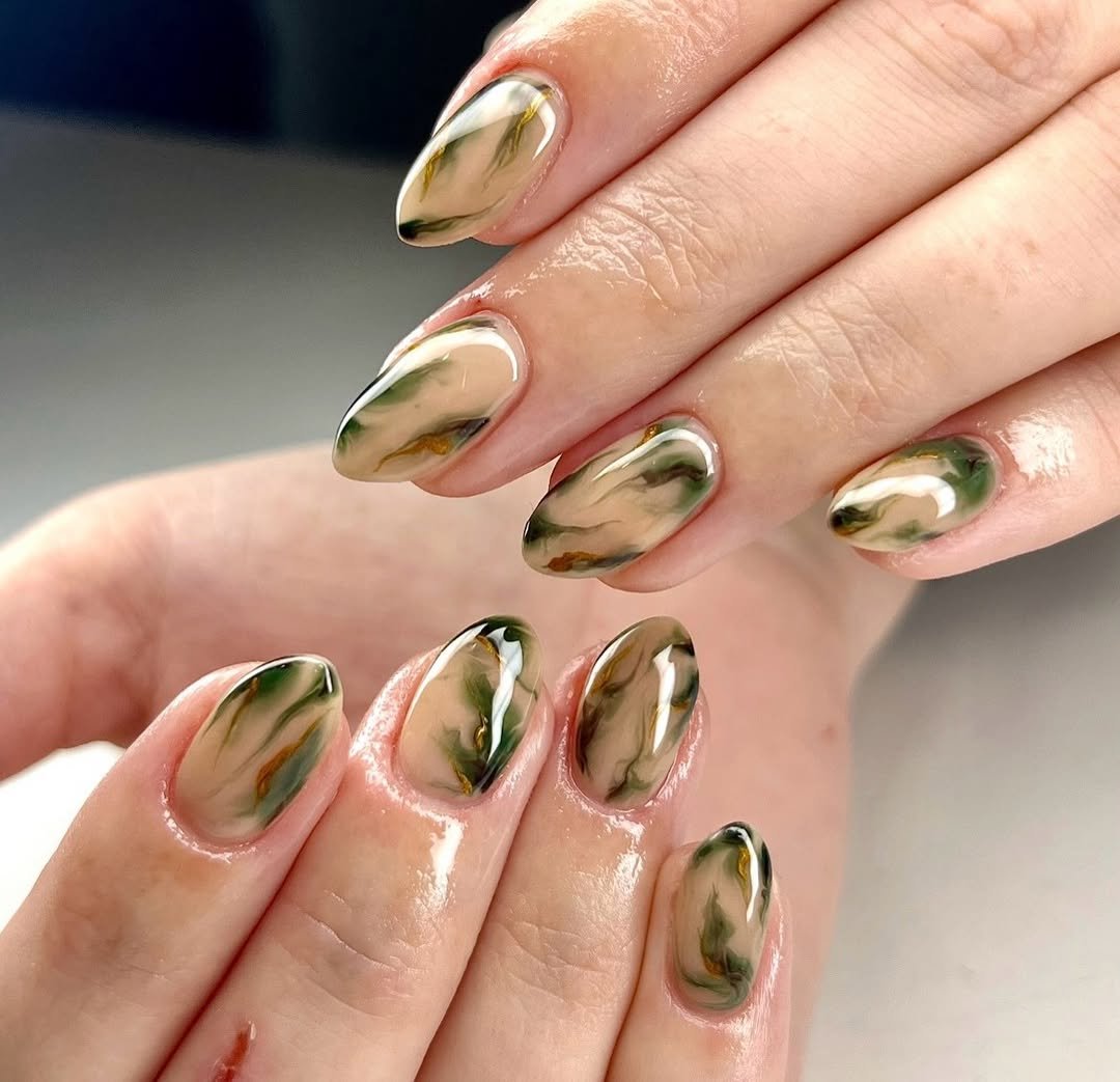 @nails.bysavannah gives us cozy earth energy with this forest-green marble look. The muted beige base keeps it neutral, while the swirls of green and gold bring just the right amount of depth and drama. It’s natural, fluid, and oh-so-fall.