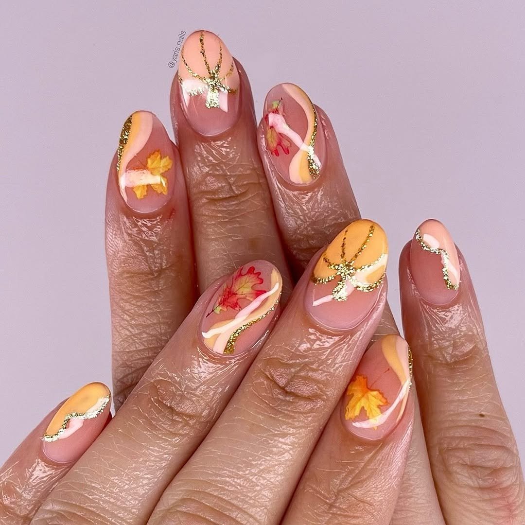 The pops of orange and red mimic real leaves, while the metallic accents add a little festive sparkle. It’s bold, but still feels wearable thanks to the translucent base.
