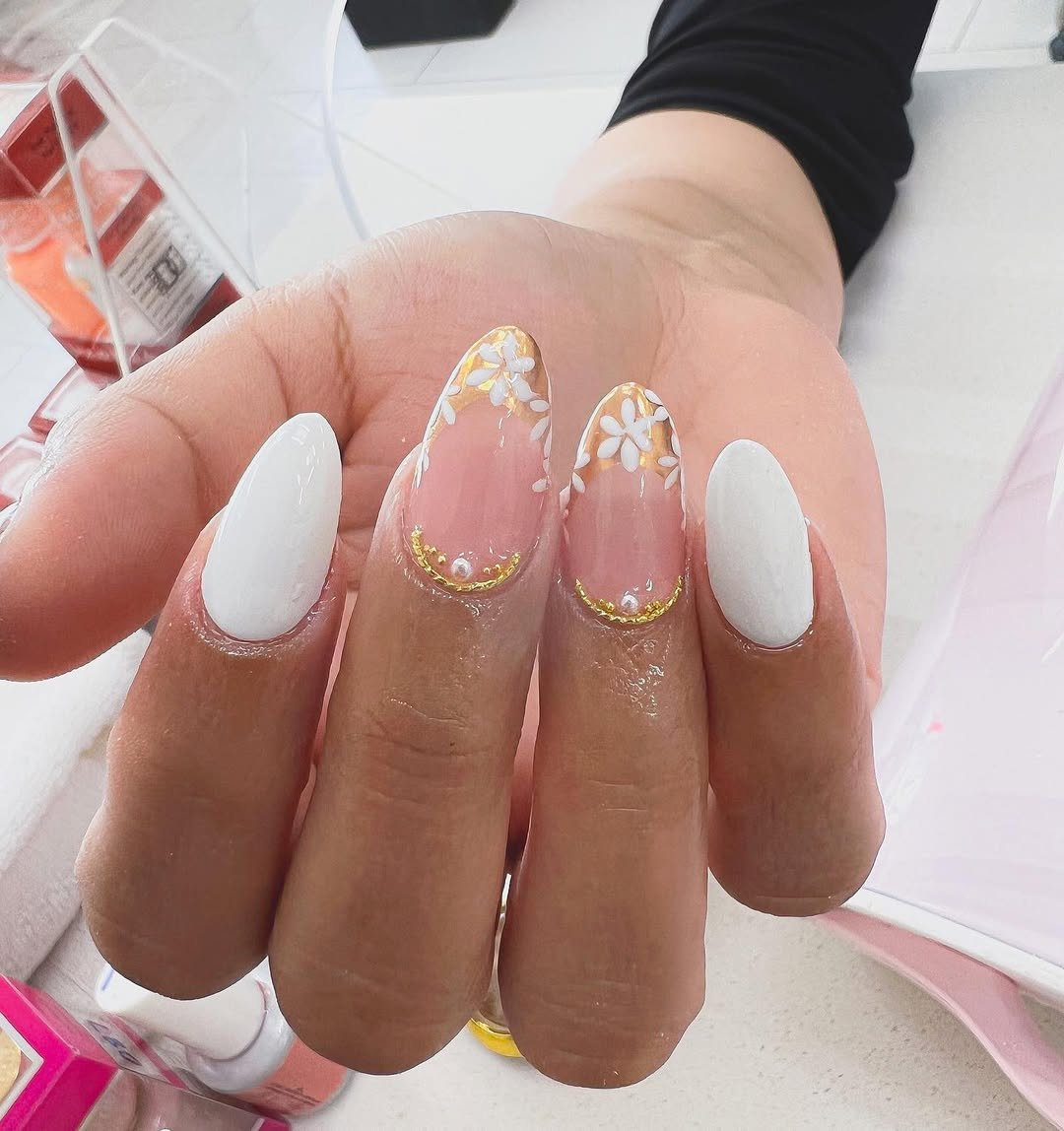 @boudoirbeauty brings dainty sophistication to the fall palette with this sweet floral design. The gold accents paired with soft white petals feel fresh, feminine, and effortlessly classy. It’s a manicure that glows — literally and figuratively.