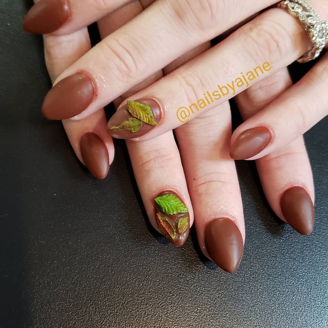 Earthy, cozy, and totally serene — @heygreatnails rounds out this lineup with a soft ombré brown blend topped with delicate leaf details. It’s subtle but full of charm, like an early autumn walk through falling leaves.