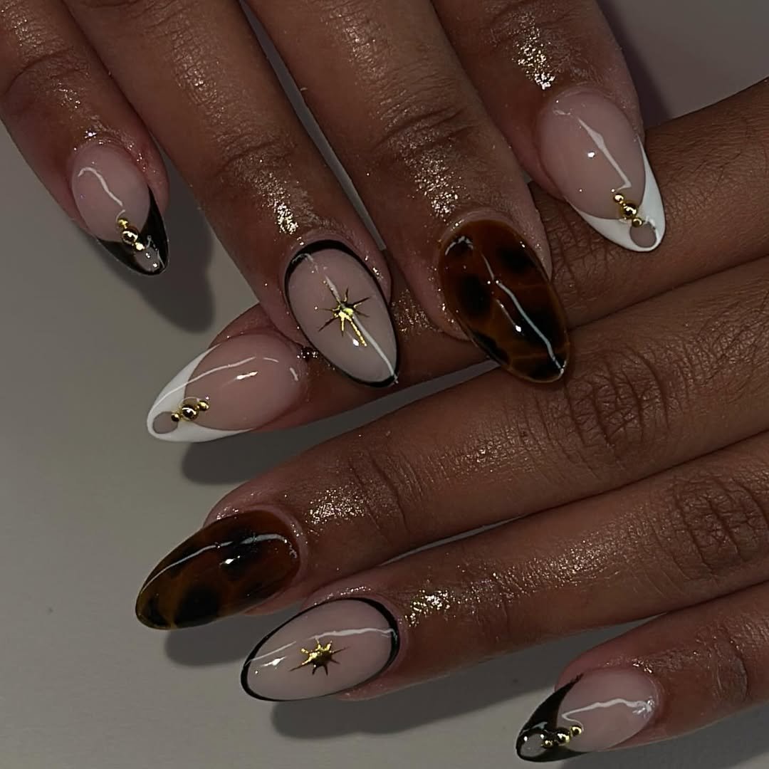 Each nail feels like its own design moment — bold lines, soft gradients, and that tortoiseshell warmth that ties it all together. The golden stars and studs are just the icing on the cake.