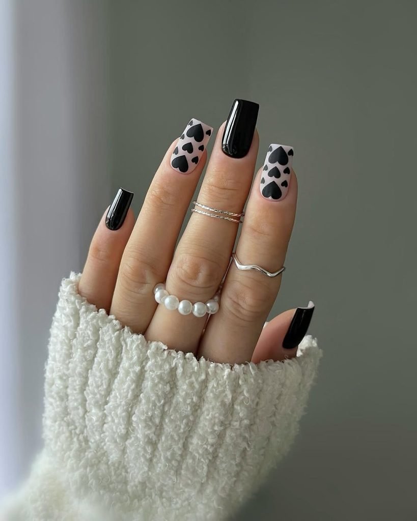 What makes this mani so captivating is the contrast—it’s sweet and striking all at once. Tiny hearts dot the nails like confetti at an ultra-stylish wedding, while the black matte accents keep the look grounded in cool sophistication. It’s romantic, but not precious. Feminine, without losing edge.