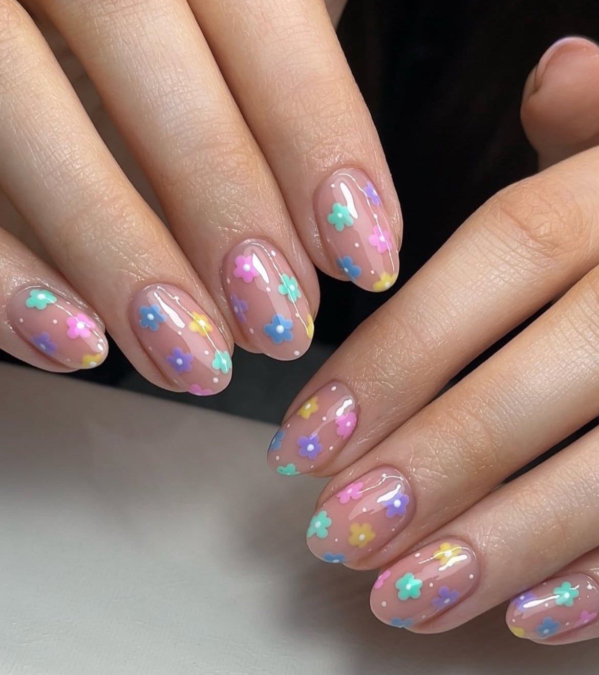 This manicure feels like tiny pieces of confetti scattered across a glossy base. The sheer pink background lets all those colorful mini flowers pop in the cutest way.