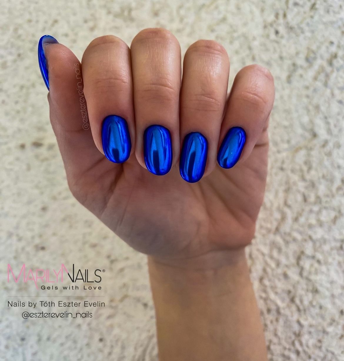 If you want a manicure that turns heads, this is it. The bold chrome blue finish reflects light like liquid metal, making the nails look futuristic and striking.