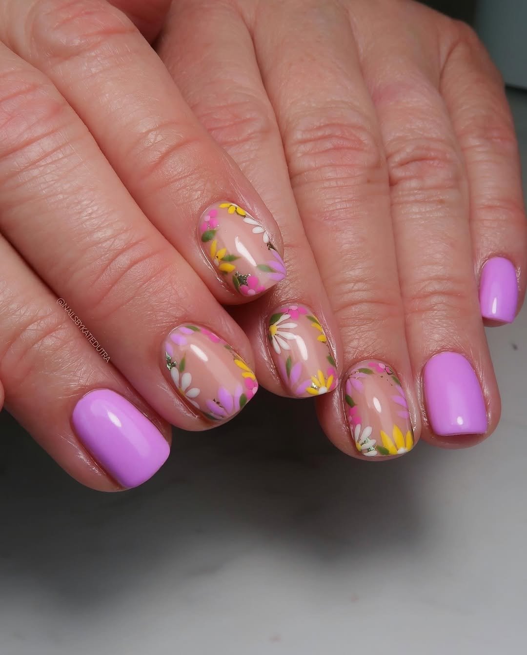 What makes this set special is how balanced it feels. The florals add personality while the solid lilac nails keep everything calm and wearable. It’s the kind of manicure that feels sweet without trying too hard.