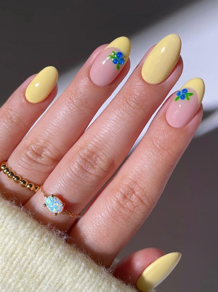 And those tiny blue floral accents? Such a cute detail. They give the manicure a playful, handmade feel that keeps the look fresh and charming instead of overly polished.