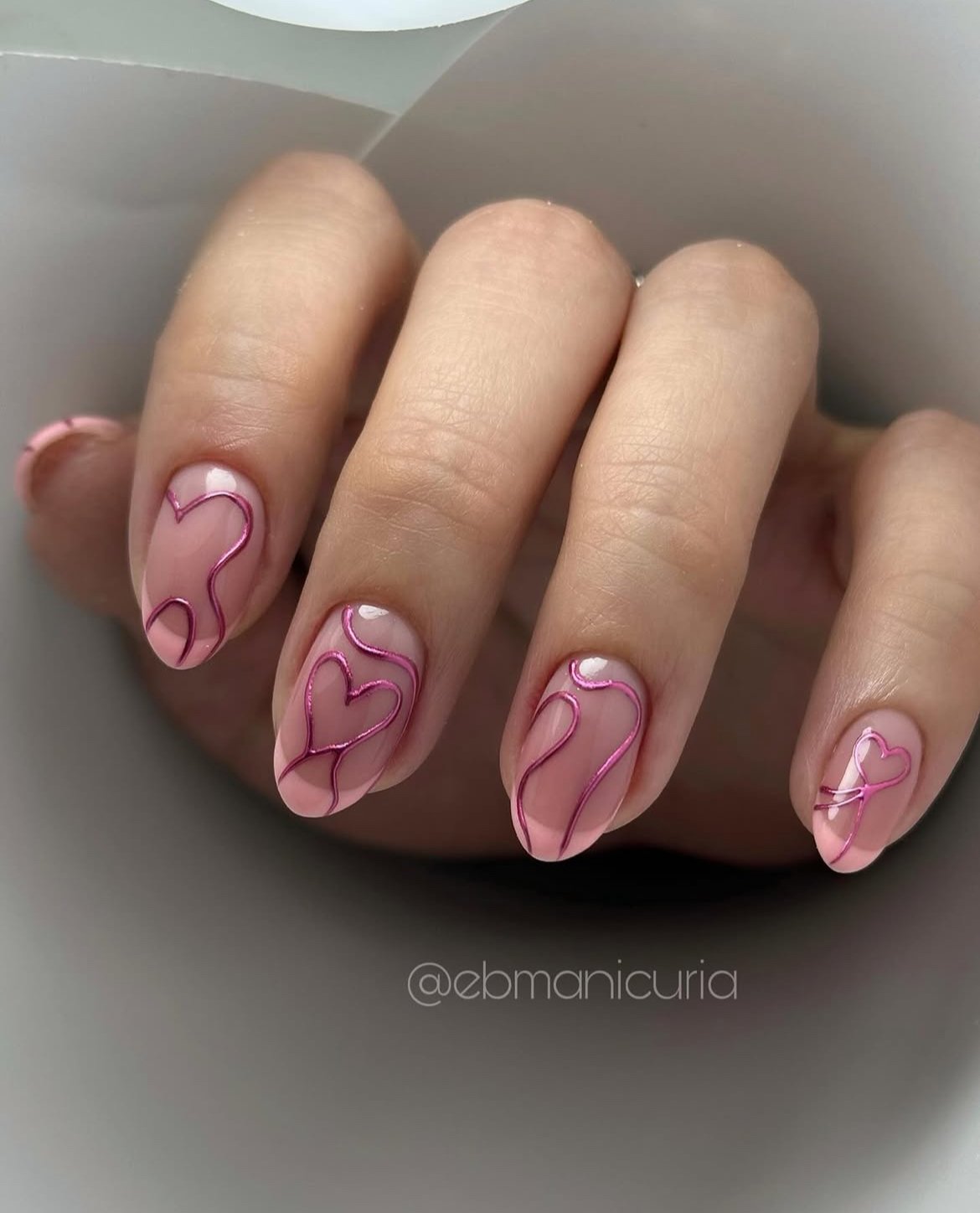 This set adds a creative twist to classic pink nails with sleek metallic heart outlines flowing across the design. The glossy blush base keeps the look soft, while the shiny chrome lines create a cool modern contrast.
