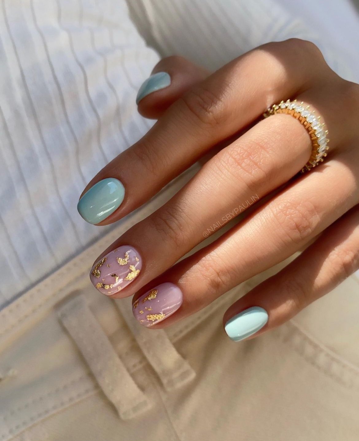 The gold foil pieces catch the light in such a subtle way, making the nails look a little more luxurious without being flashy. It’s elegant, soft, and perfect for anyone who loves a pastel palette with a bit of sparkle.