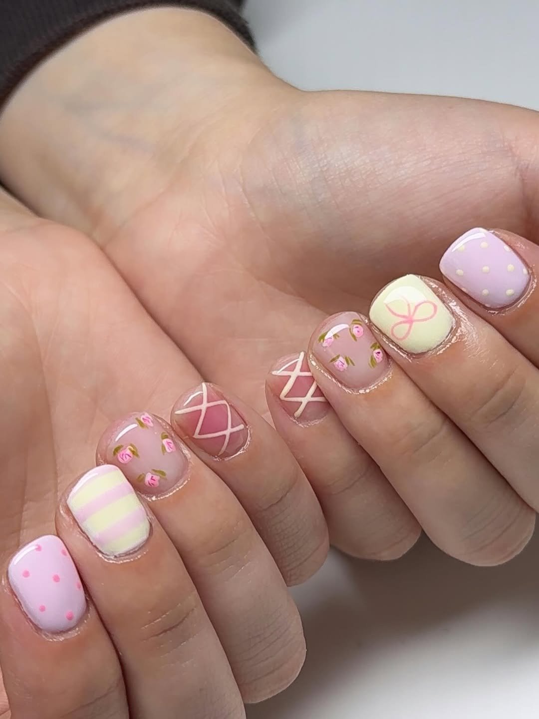 If you love a little variety, this manicure delivers. Each nail has its own tiny personality—soft stripes, delicate florals, polka dots, and cute little bows all working together in a pastel palette.