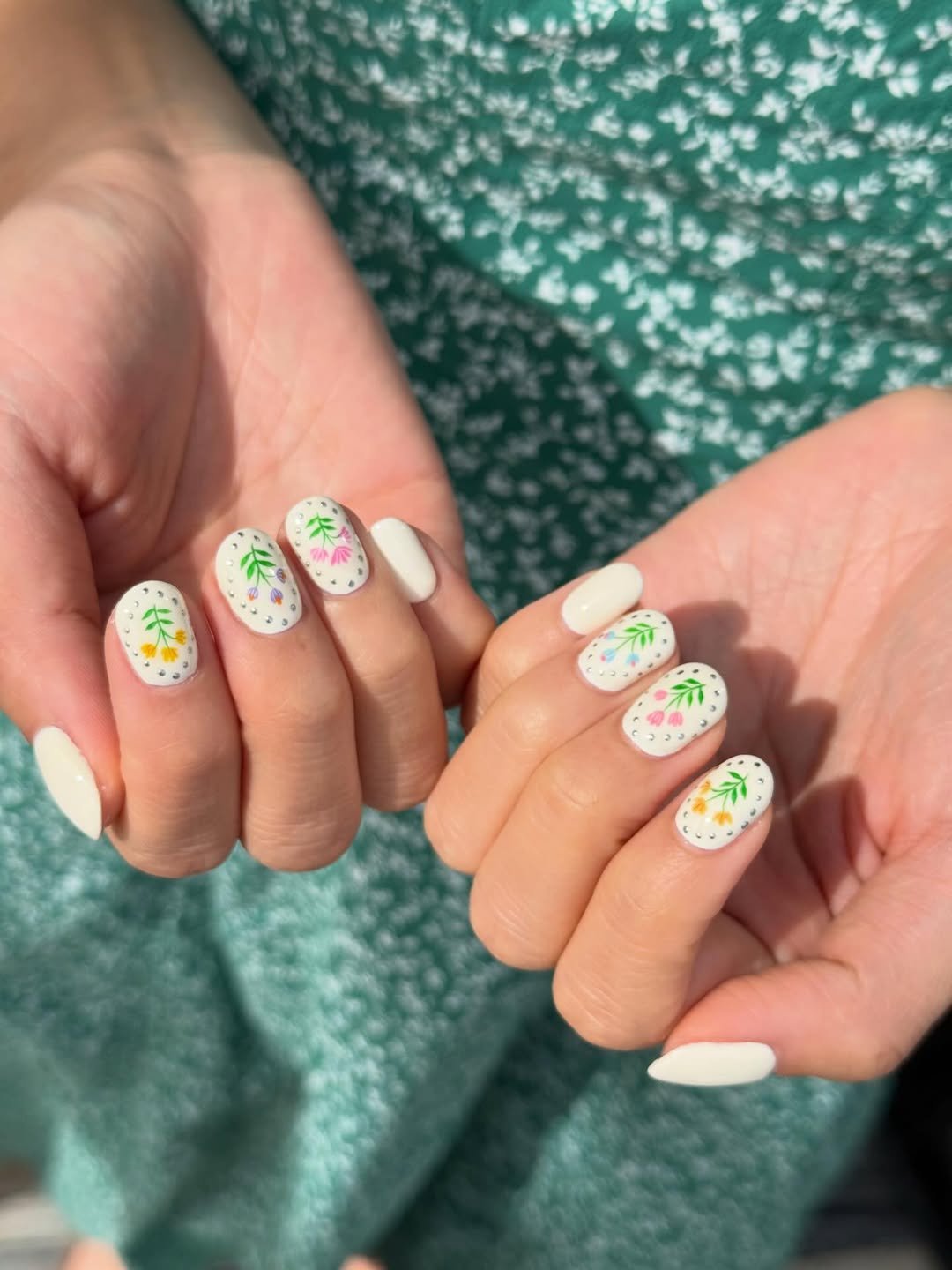 This manicure feels like a miniature garden blooming right on your nails. The clean white base creates the perfect canvas for those tiny colorful flowers and delicate leafy details.