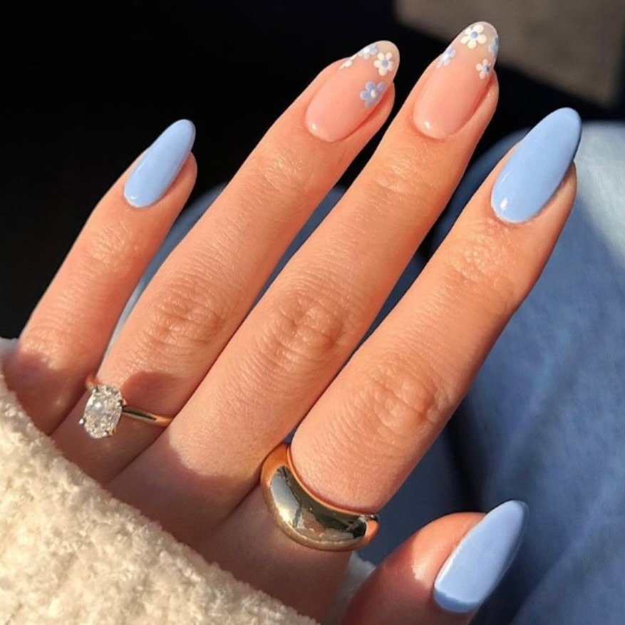 Soft sky blue paired with delicate white daisies is always a win. The almond shape keeps it elegant, while the floral detail adds just enough charm.