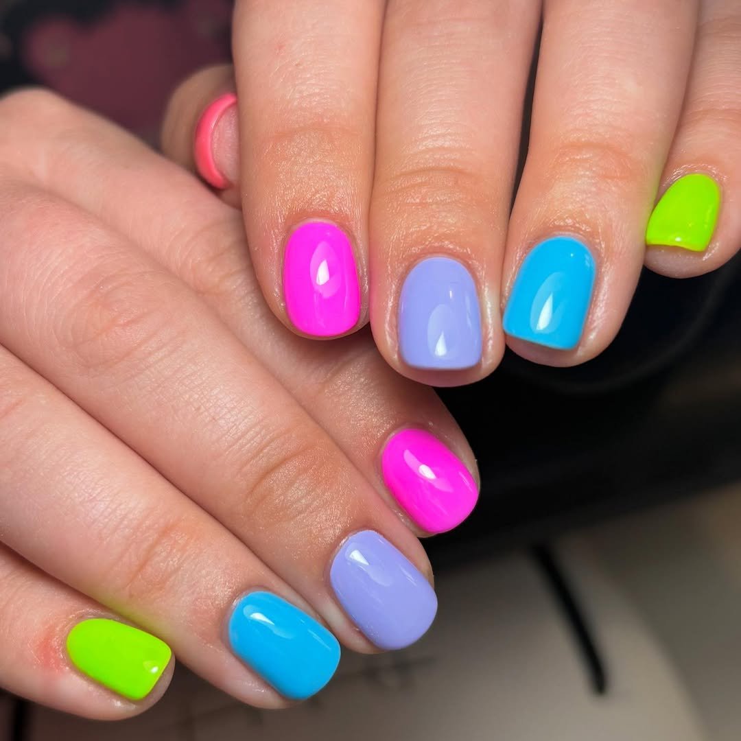 Hot pink, lavender, neon green, bright blue—each nail a solid, punchy color. And that’s it. No designs needed.