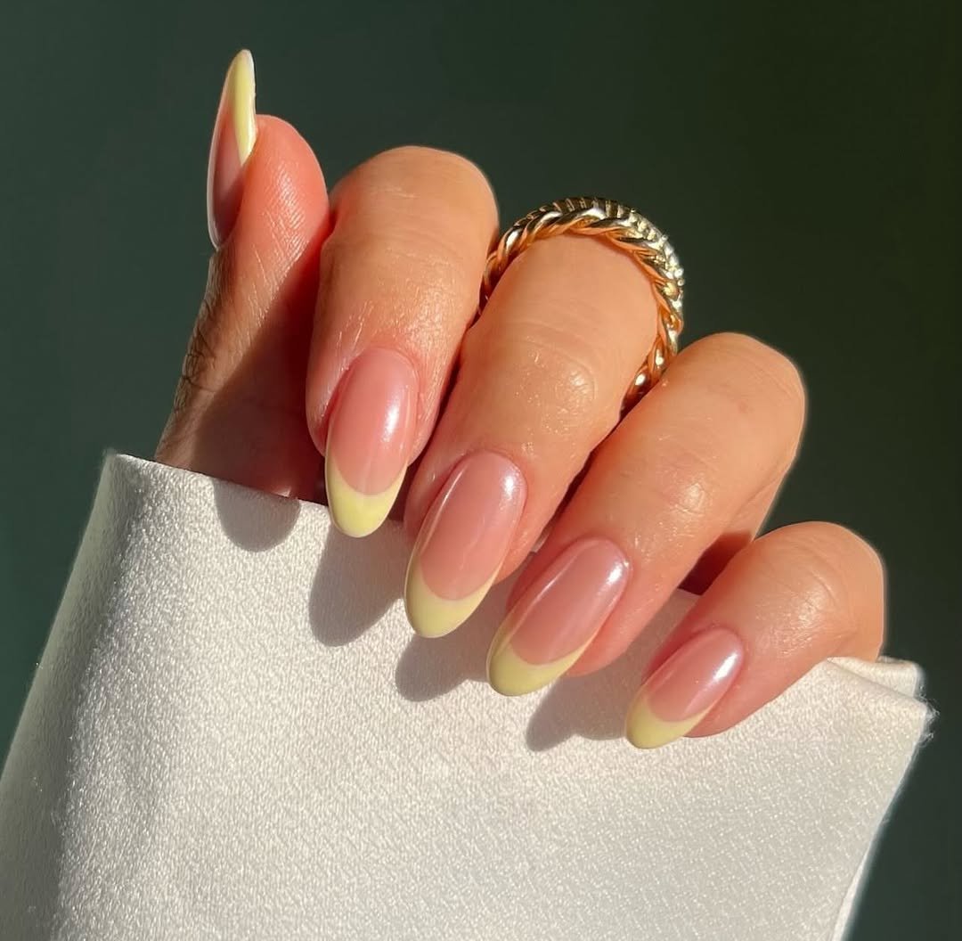 This is the softest kind of sunshine. A sheer pink base with creamy pastel yellow tips that melt perfectly into the almond shape—simple, but stunning.