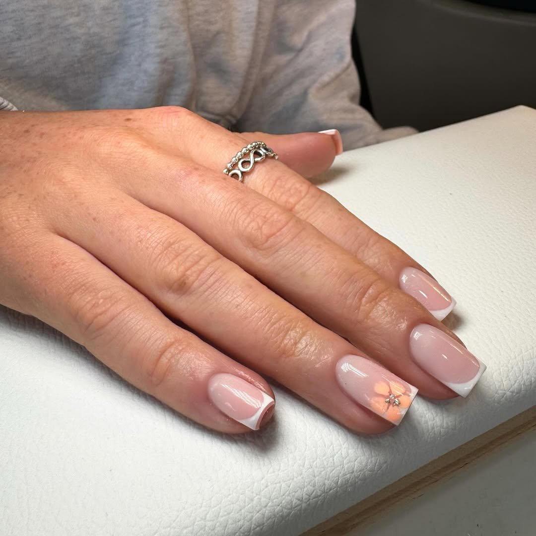 Classic French tips, but make them flirty. Crisp white edges paired with soft peachy florals create that perfect balance between clean and cute.