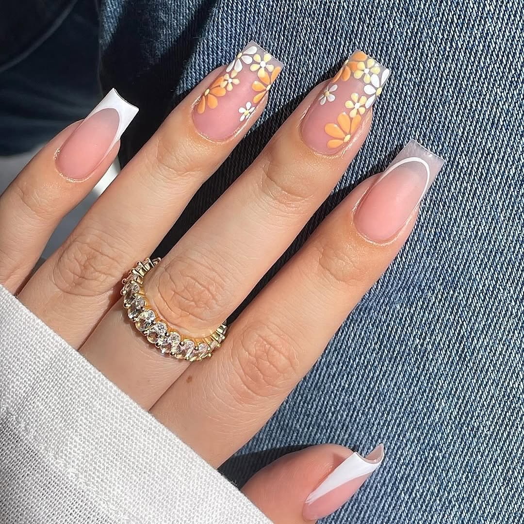 A crisp white French base with scattered yellow and white daisies? Effortlessly pretty. The square shape gives it structure, while the florals soften everything up.