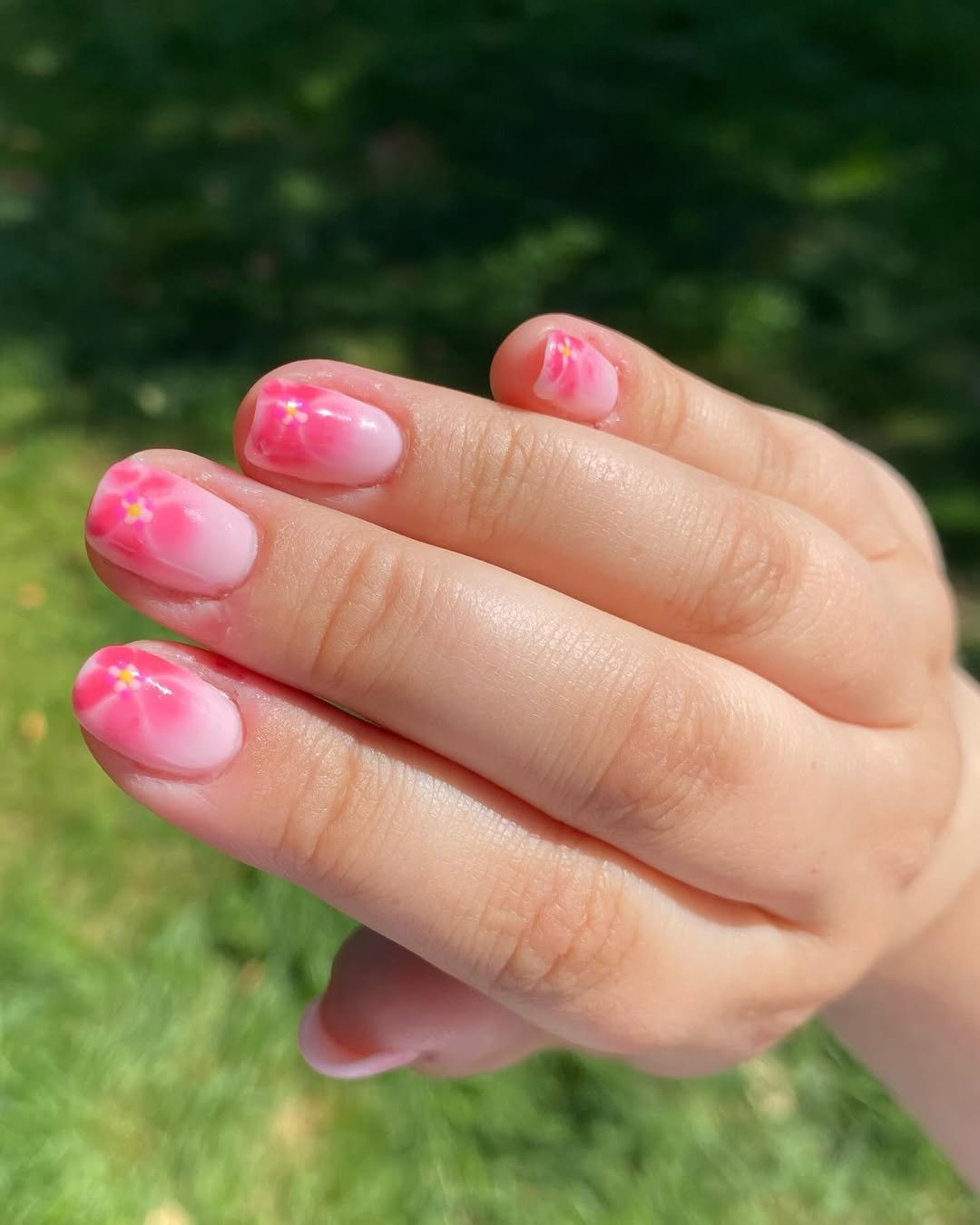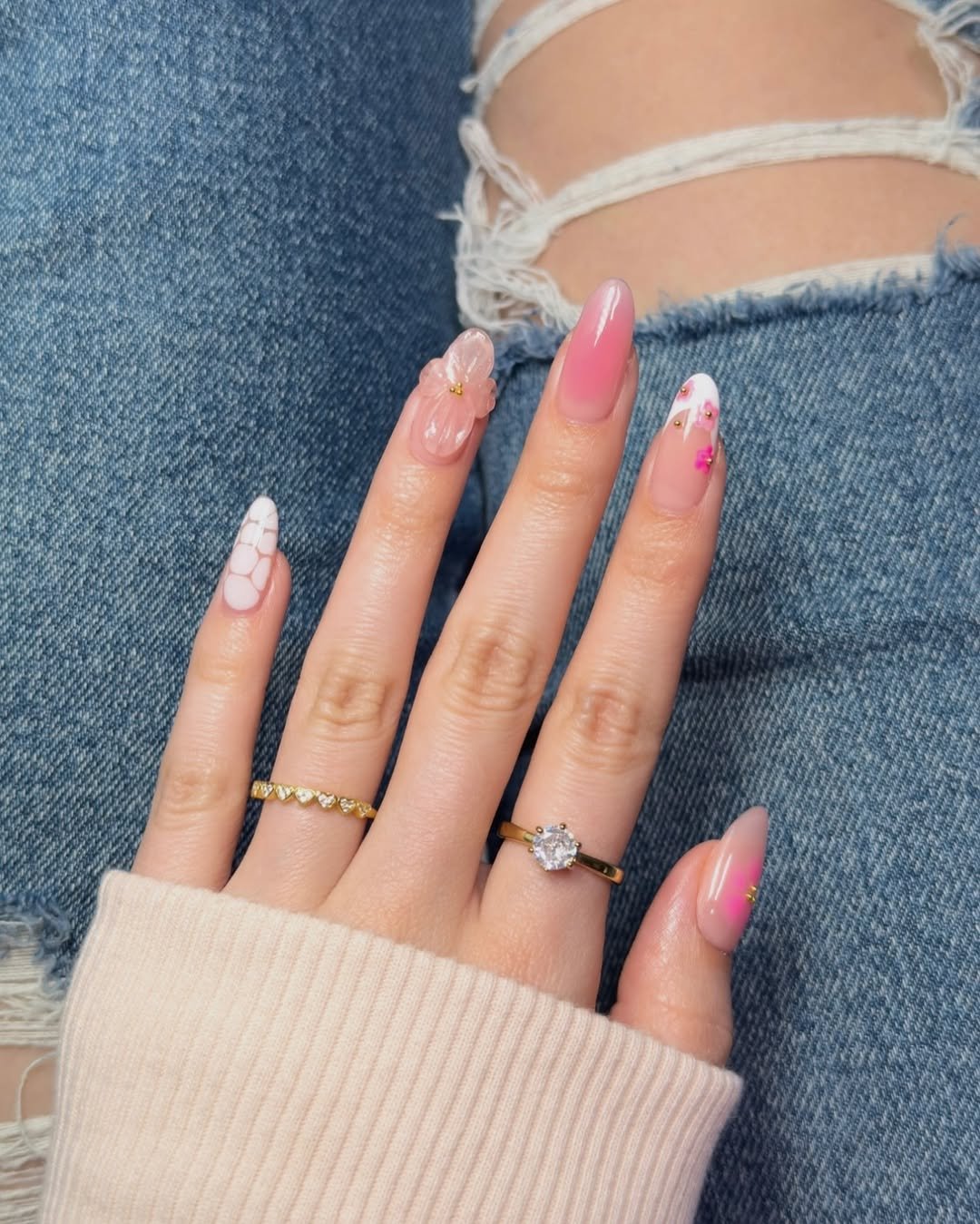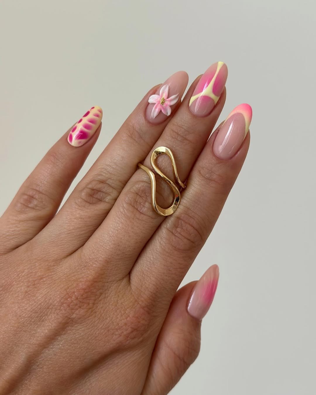 This one is all about that blend. Hot pink melts into soft nude, with abstract swirls and a tiny 3D flower moment that makes it feel extra special.