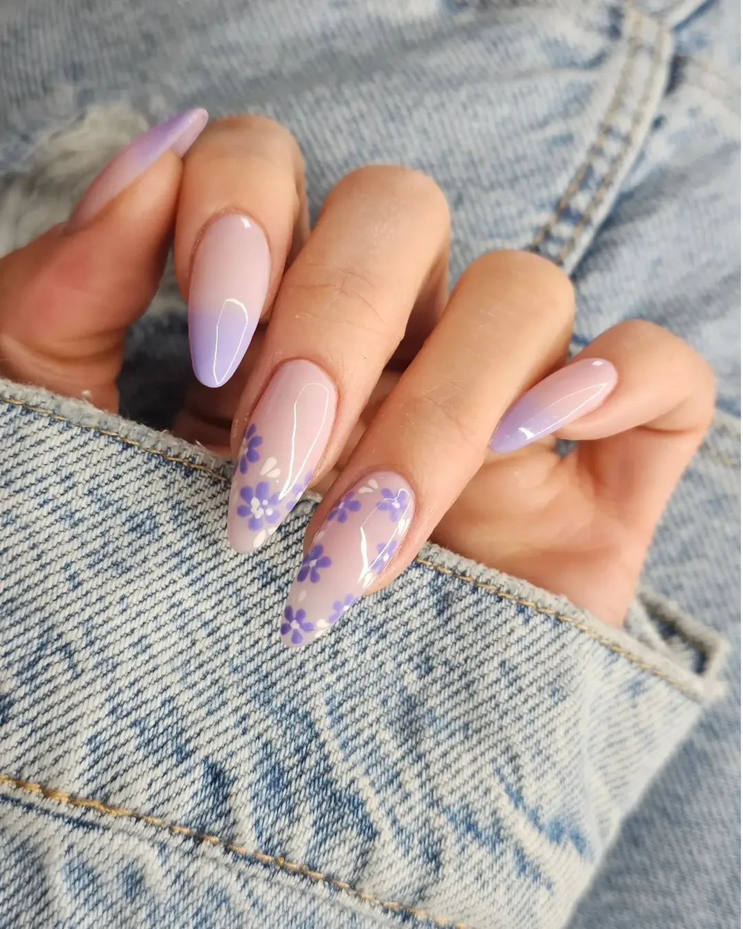 This set is soft, glowy, and quietly stunning. A milky lavender base melts into a deeper purple tip, with tiny floral details floating across a couple of nails like pressed flowers in resin.