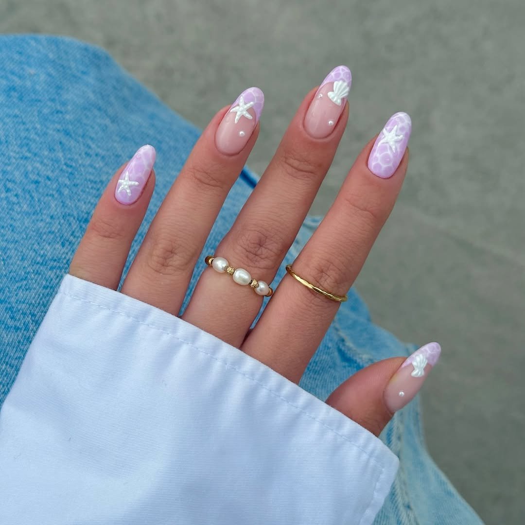 Soft lilac marble swirls, tiny pearls, starfish accents—this set is giving beach day but make it pastel. It’s whimsical without crossing into costume territory.