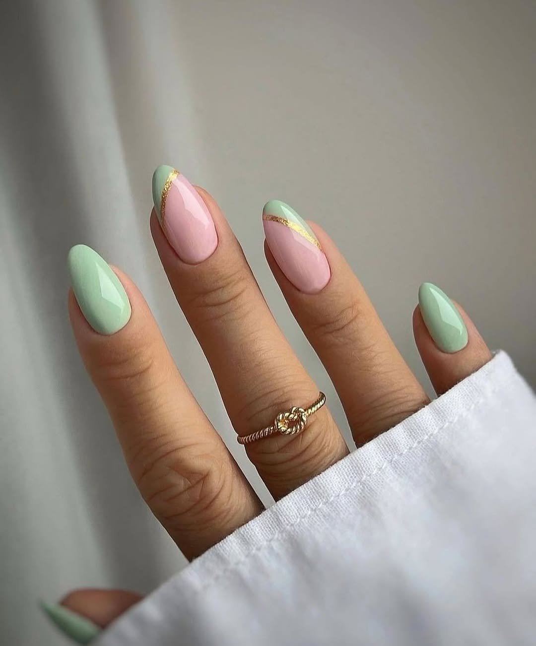 This pastel mint and soft blush combo is so effortlessly pretty. The thin gold line detail adds just a hint of glam without overpowering the clean color blocking.