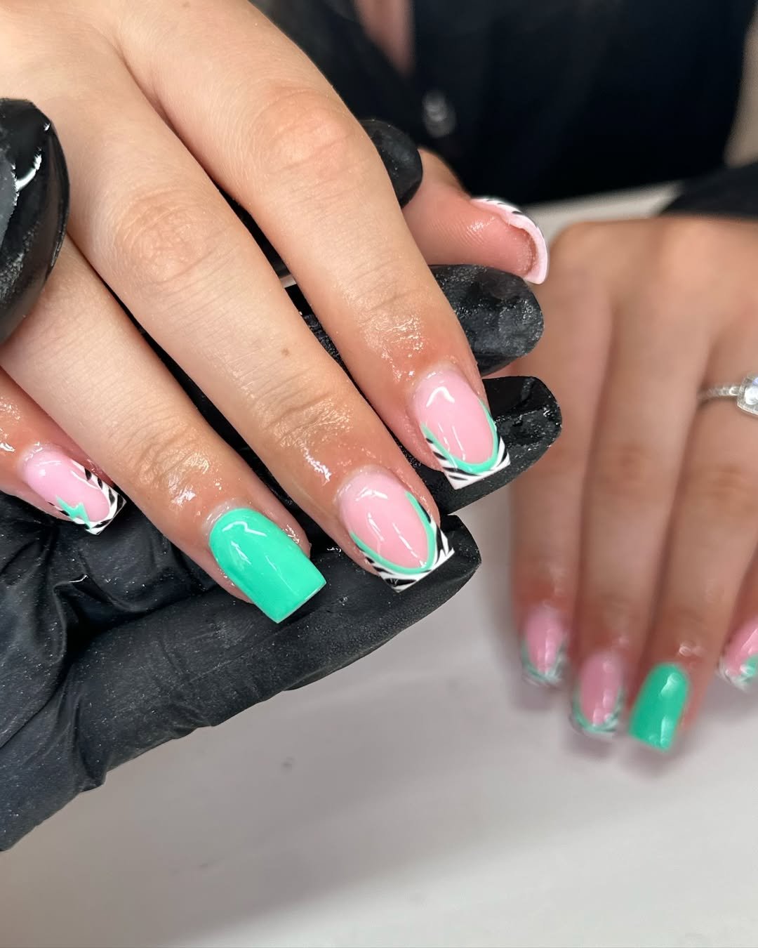 A glossy mint green paired with clean pink bases and delicate white detailing—so fresh, so easy. The solid mint nail adds a bold touch, while the outlined tips keep everything playful.