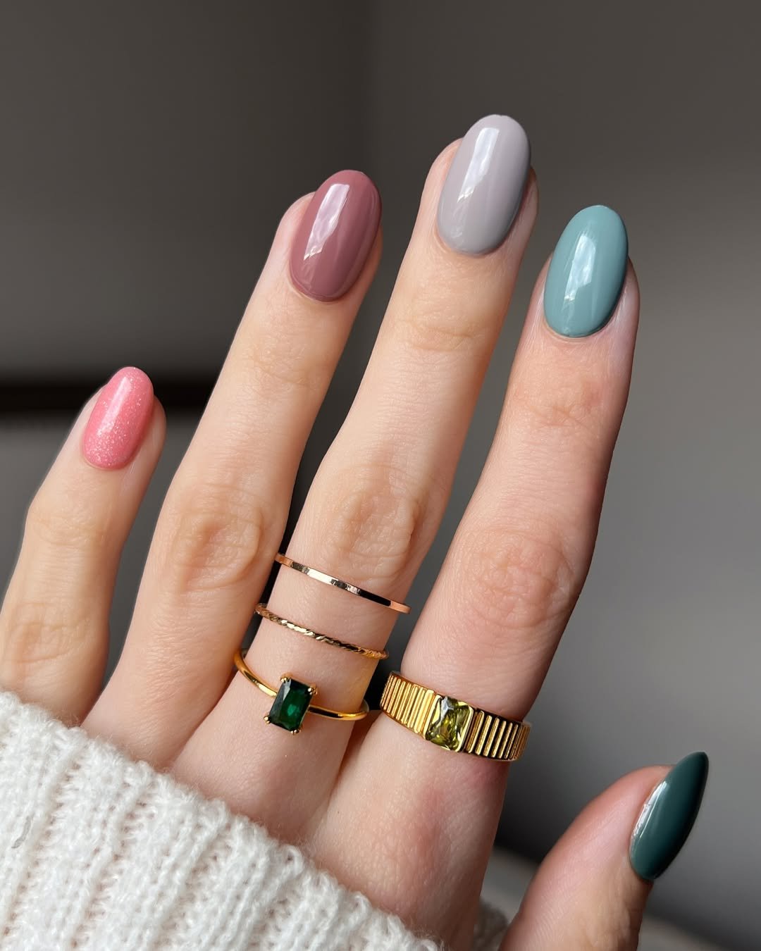Different shades on each nail—dusty rose, grey, teal, soft pink—but all within the same muted family. It’s simple color blocking done right.