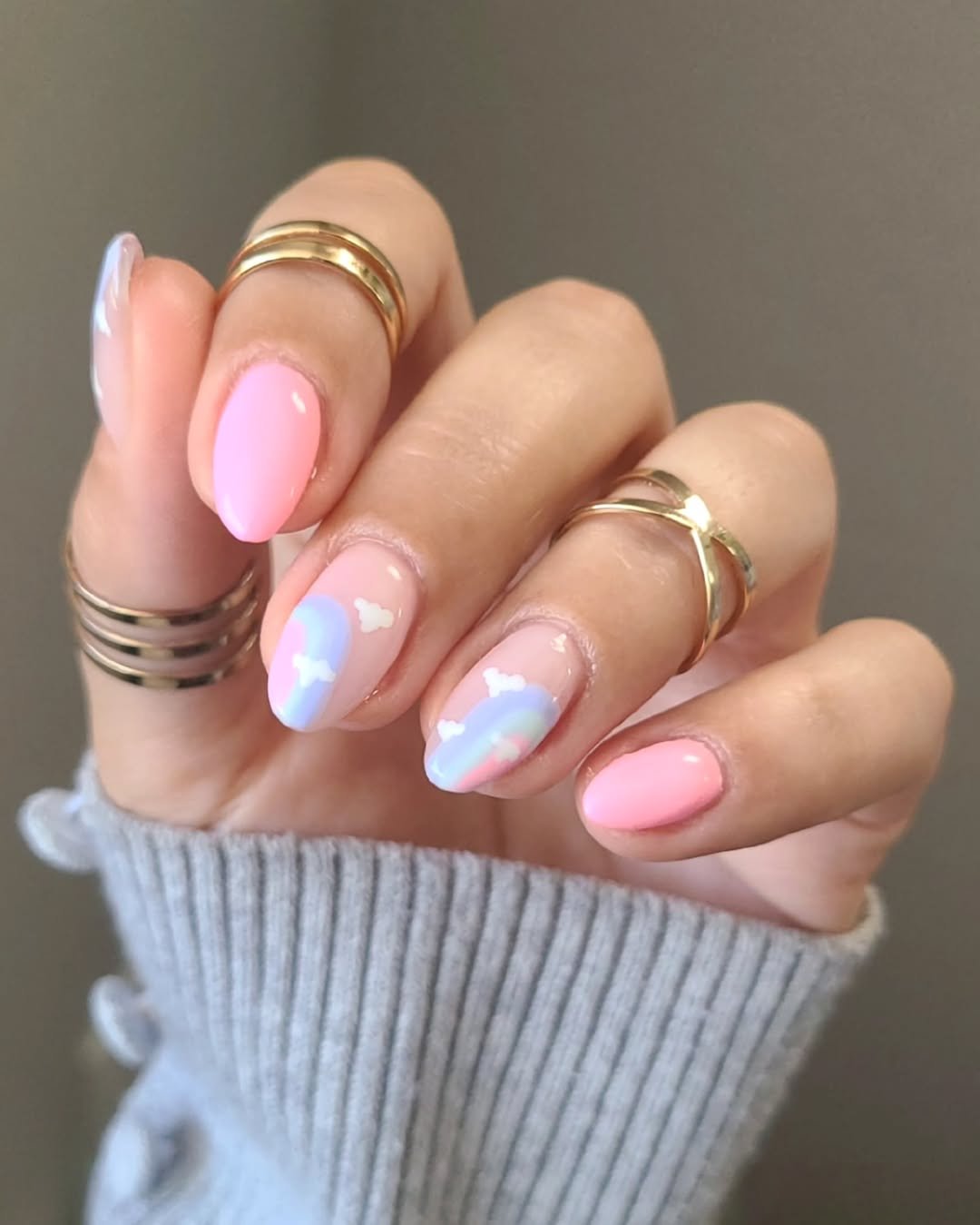 This one feels like a literal daydream. Soft pink and baby blue swirls with tiny white cloud details? It’s sweet, airy, and surprisingly simple.