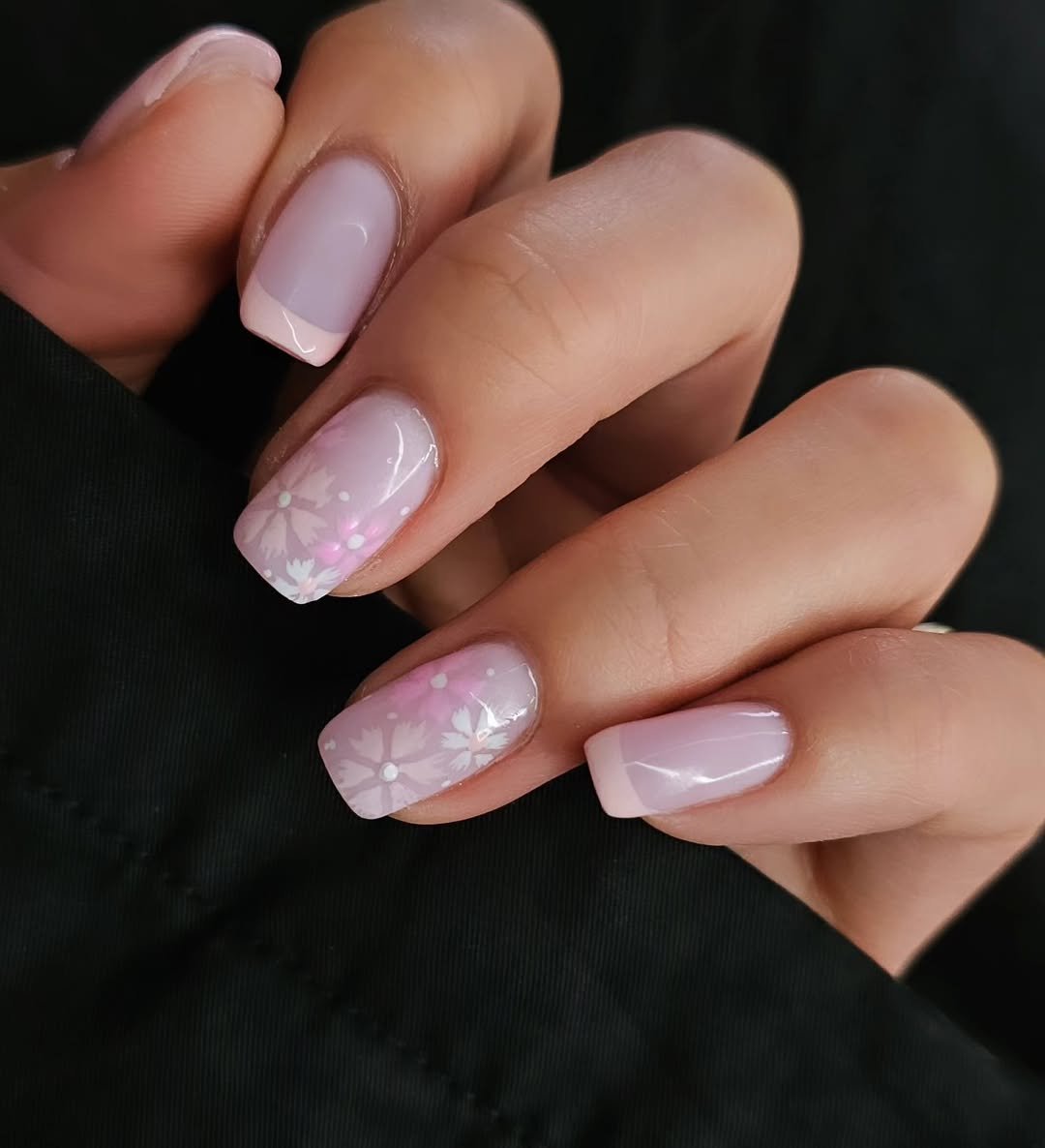 Here we’ve got a barely-there pink base with the softest white French tips and dreamy floral overlays. It’s minimal, but those faded petals add just enough romance.