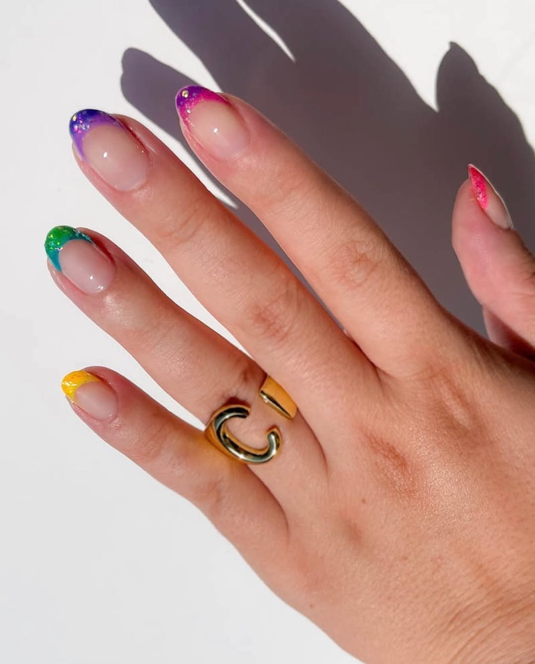 This is your everyday nude manicure… but with a colorful surprise. Each tip gets a different glitter shade—purple, pink, green, yellow—so it feels fun without being loud.