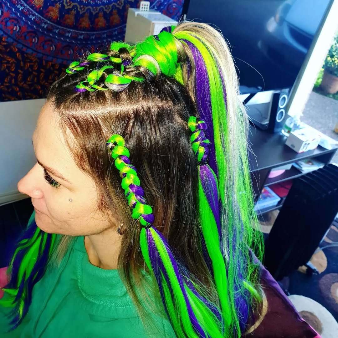 Neon green and purple woven into sleek braids instantly turn this into a standout look. The color placement feels intentional, framing the face without overwhelming it.
