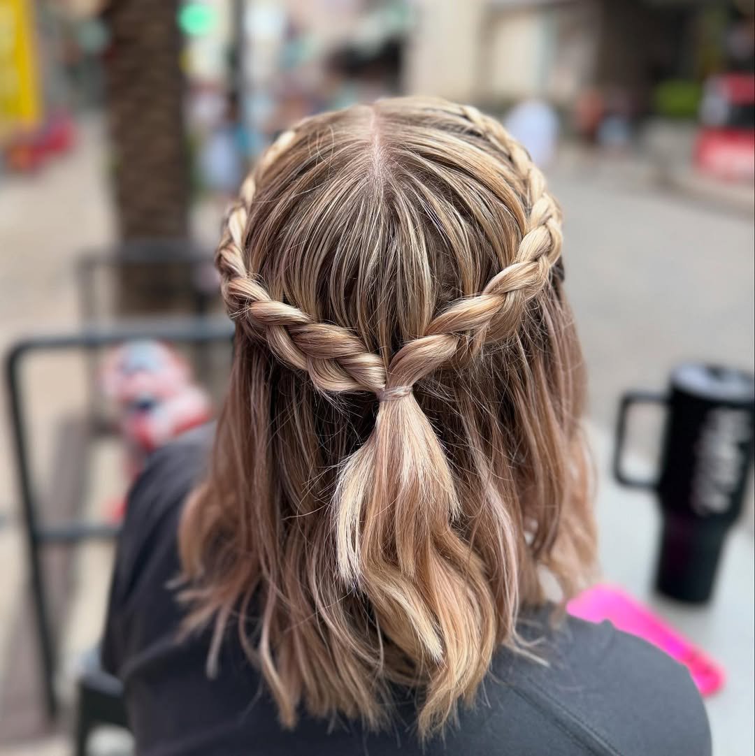 This one is quietly charming. A soft halo braid wraps around the head and melts into a low pony that feels relaxed, airy, and incredibly wearable.